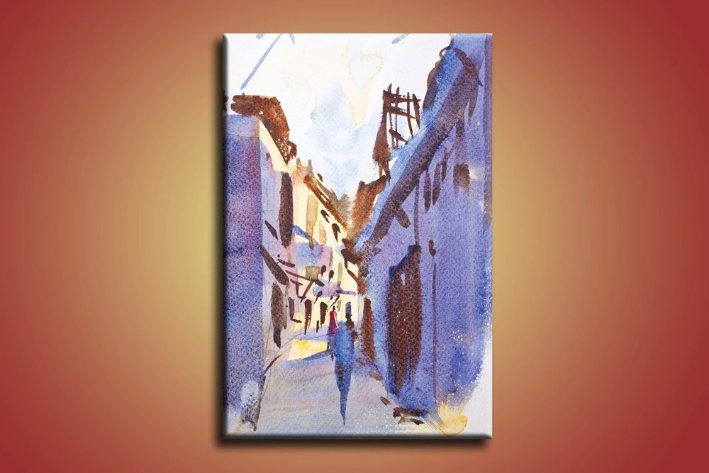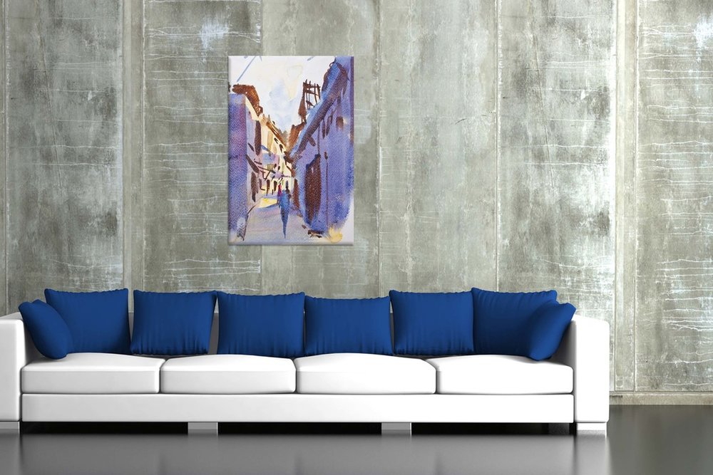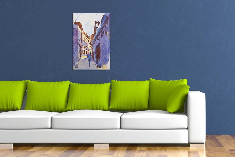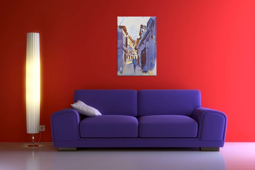 Plátno je ručne natiahnuté na napínaci rám /blindrám/. Plátno štandardne napíname na drevené Blind rámy, ktoré sa dajú priamo zavesiť.