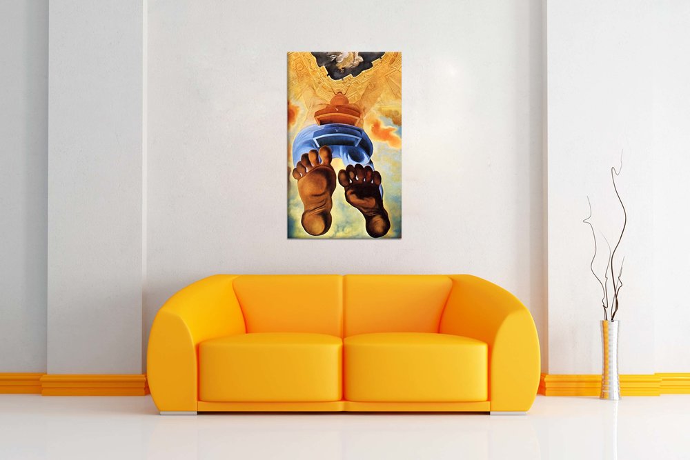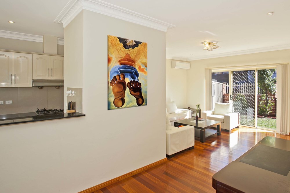 Plátno je ručne natiahnuté na napínaci rám /blindrám/. Plátno štandardne napíname na drevené Blind rámy, ktoré sa dajú priamo zavesiť.