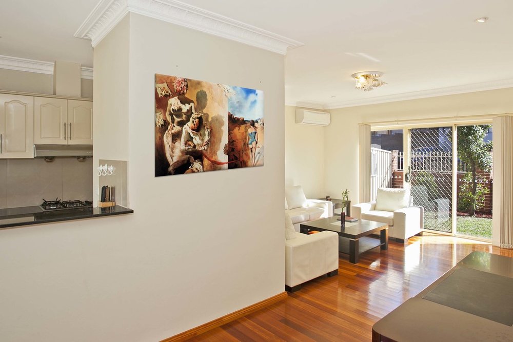 Plátno je ručne natiahnuté na napínaci rám /blindrám/. Plátno štandardne napíname na drevené Blind rámy, ktoré sa dajú priamo zavesiť.