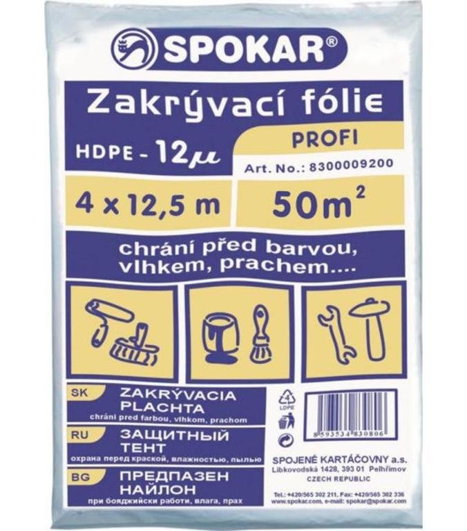 Zakrývacia fólia s rozmermi 4 x 12,5 m chráni pred farbou, prachom či vlhkom. Sila fólie je 12 my (mikrónov).