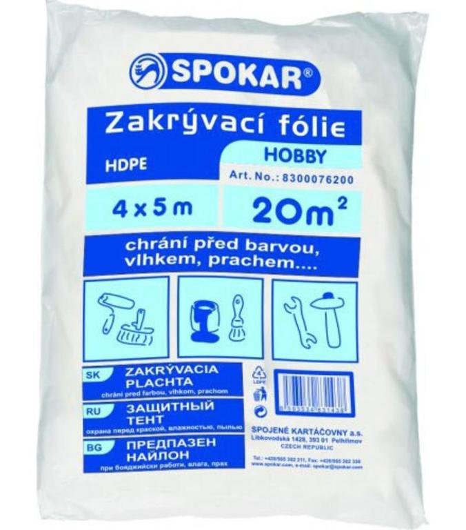 Zakrývacia fólia s rozmermi 4 x 5 m chráni pred farbou, prachom či vlhkom. Sila fólie je 5 my (mikrónov).