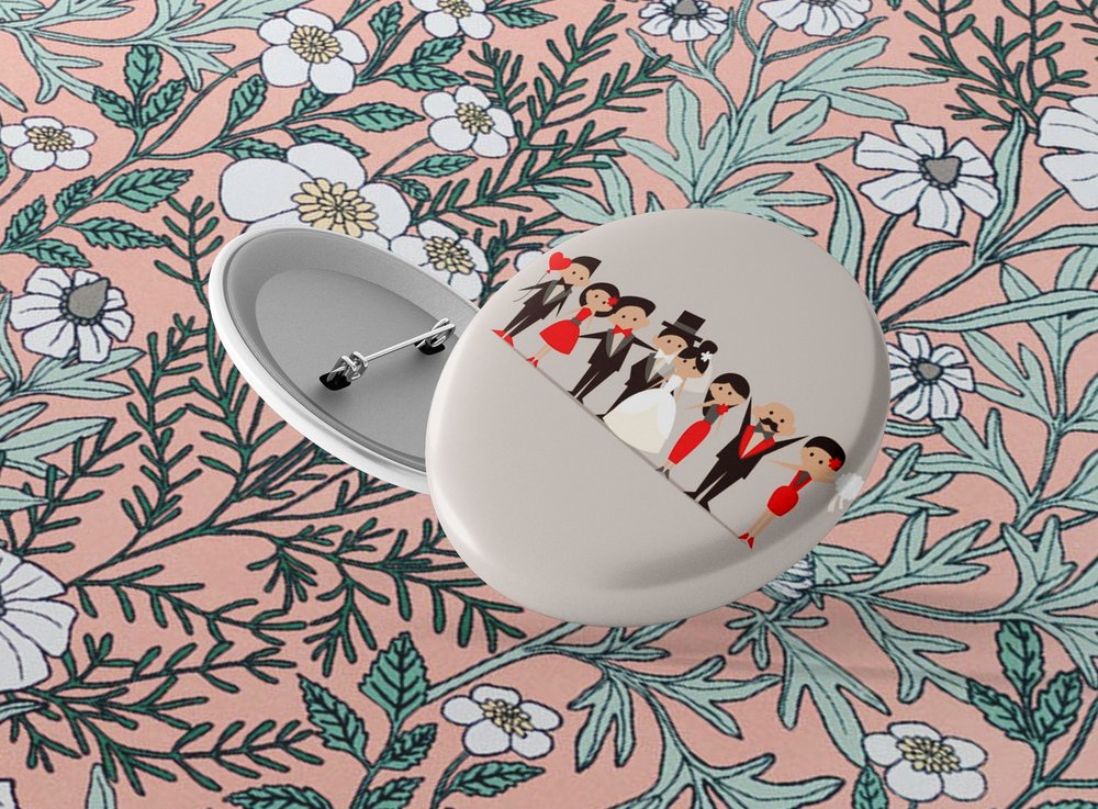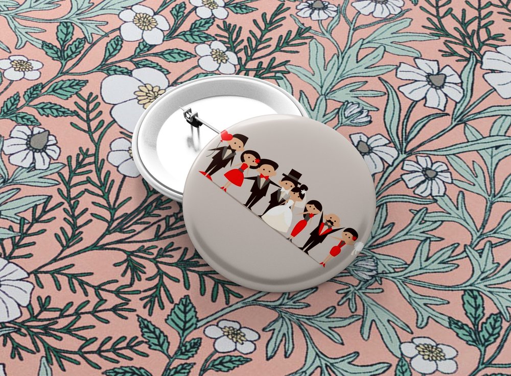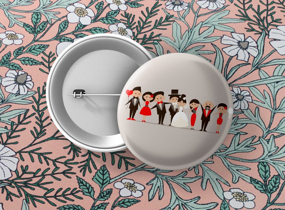 Okrúhle kovové odznaky so zatváracím špendlíkom sú vhodným suvenírom, ktorý môžete pripnúť na odev či batoh. Odznak je vypuklý a pôsobí 3D dojmom. Odznaky pre svadobčanov - milá alternatíva svadobných pierok. Odznak môžete pripnúť na akékoľvek miesto odevu, bez nejakého poškodenia textílie.